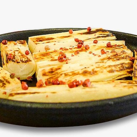 Deliciosos toletes de Palmito cortados ao meio e grelhados na chapa de ferro com Pimenta Rosa, que proporciona incrível aroma.