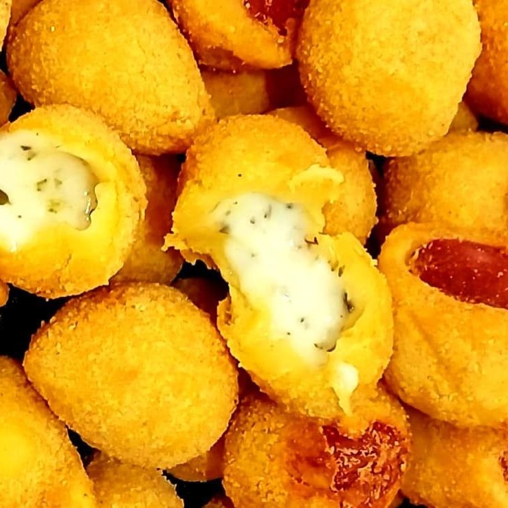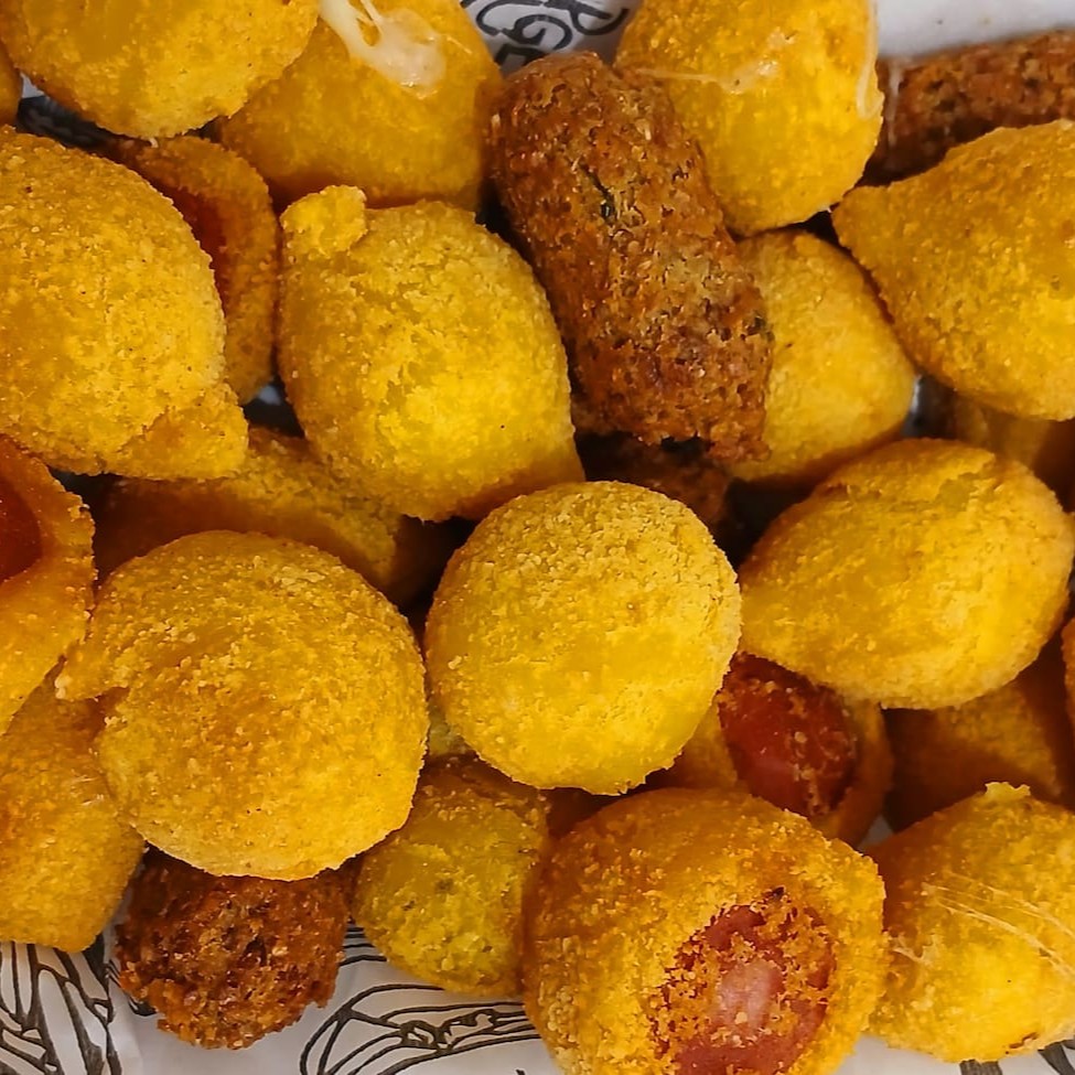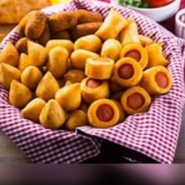 Delicie-se com a nossa irresistível seleção de '50 Salgados Misto', perfeitamente preparados para satisfazer o seu paladar. Este prato inclui uma coxinha de frango irresistivelmente cremosa, bolinhas de queijo finamente temperadas com orégano, travesseirinhos de queijo e presunto que derretem na boca,