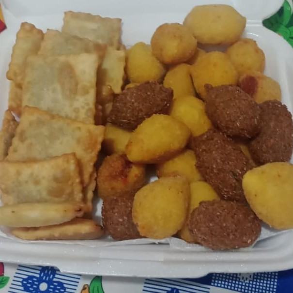 80 Salgados Misto (Coxinha de frango cremosa, Bolinha de queijo com Orégano, balãozinho de queijo e presunto, enroladinho de salsicha e kibe. Salgado de 20 gramas)+ 15 churros + 1 Refrigerante 1lt