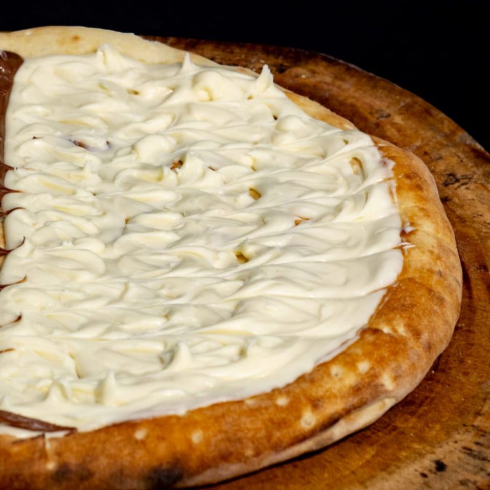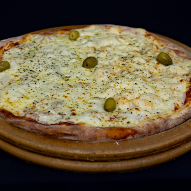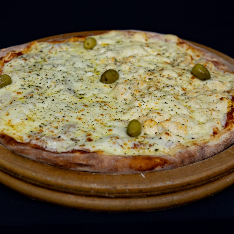 Molho de tomate, mussarela, requeijão cremoso, orégano e azeitonas