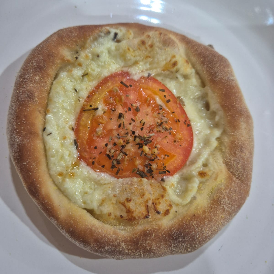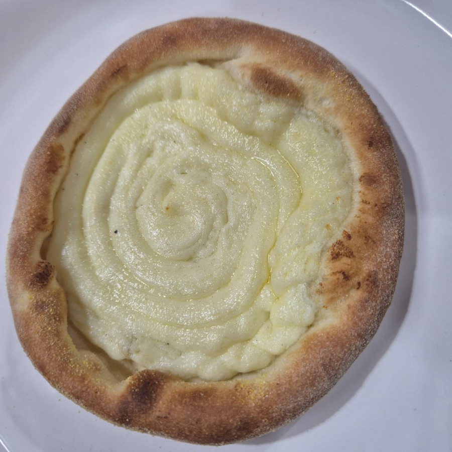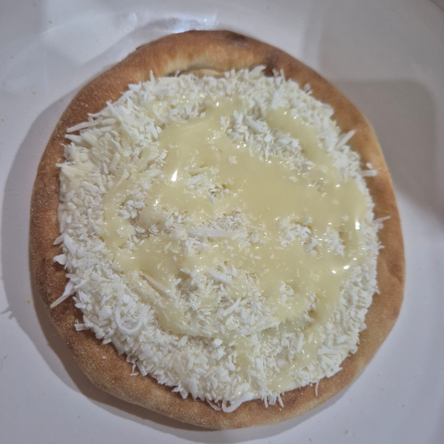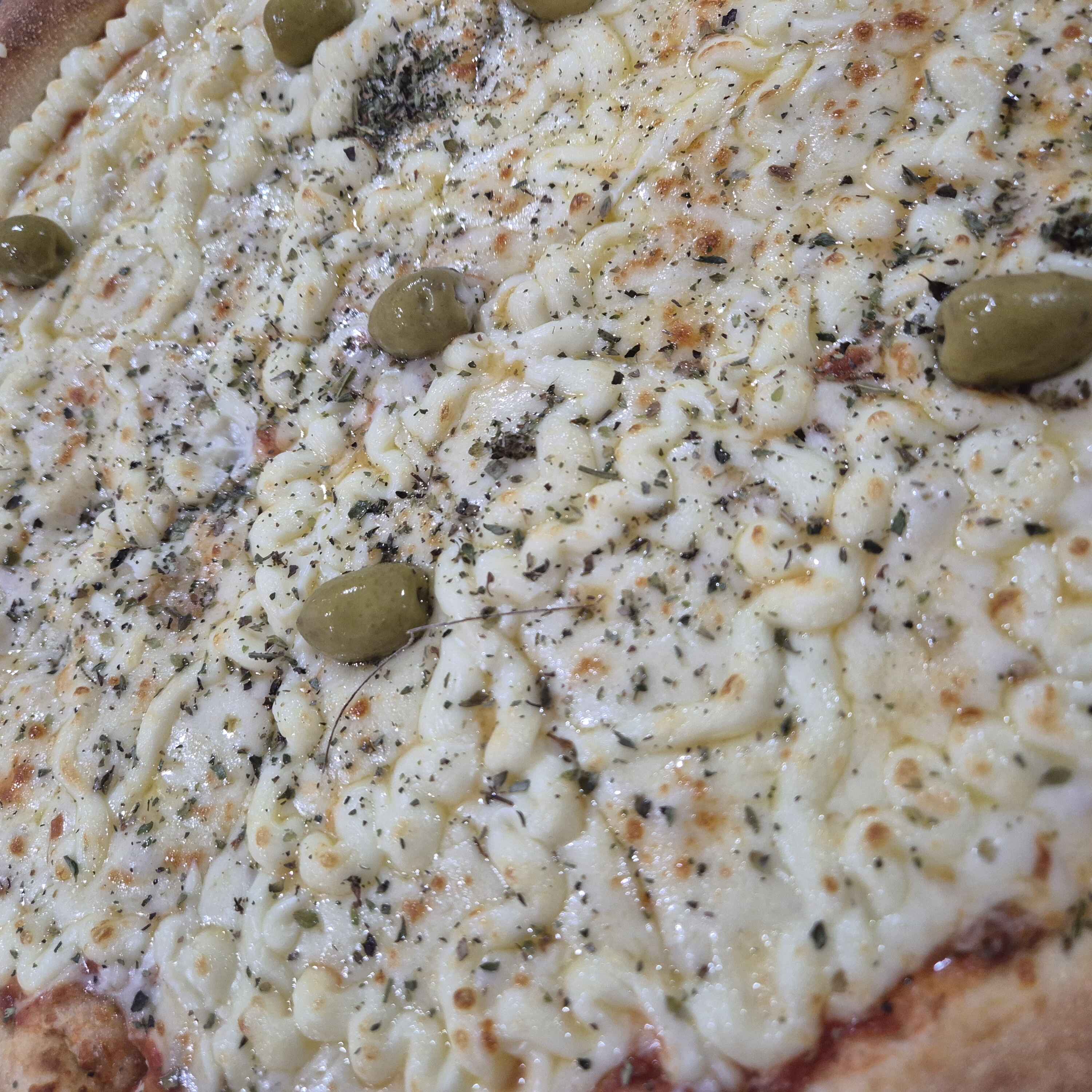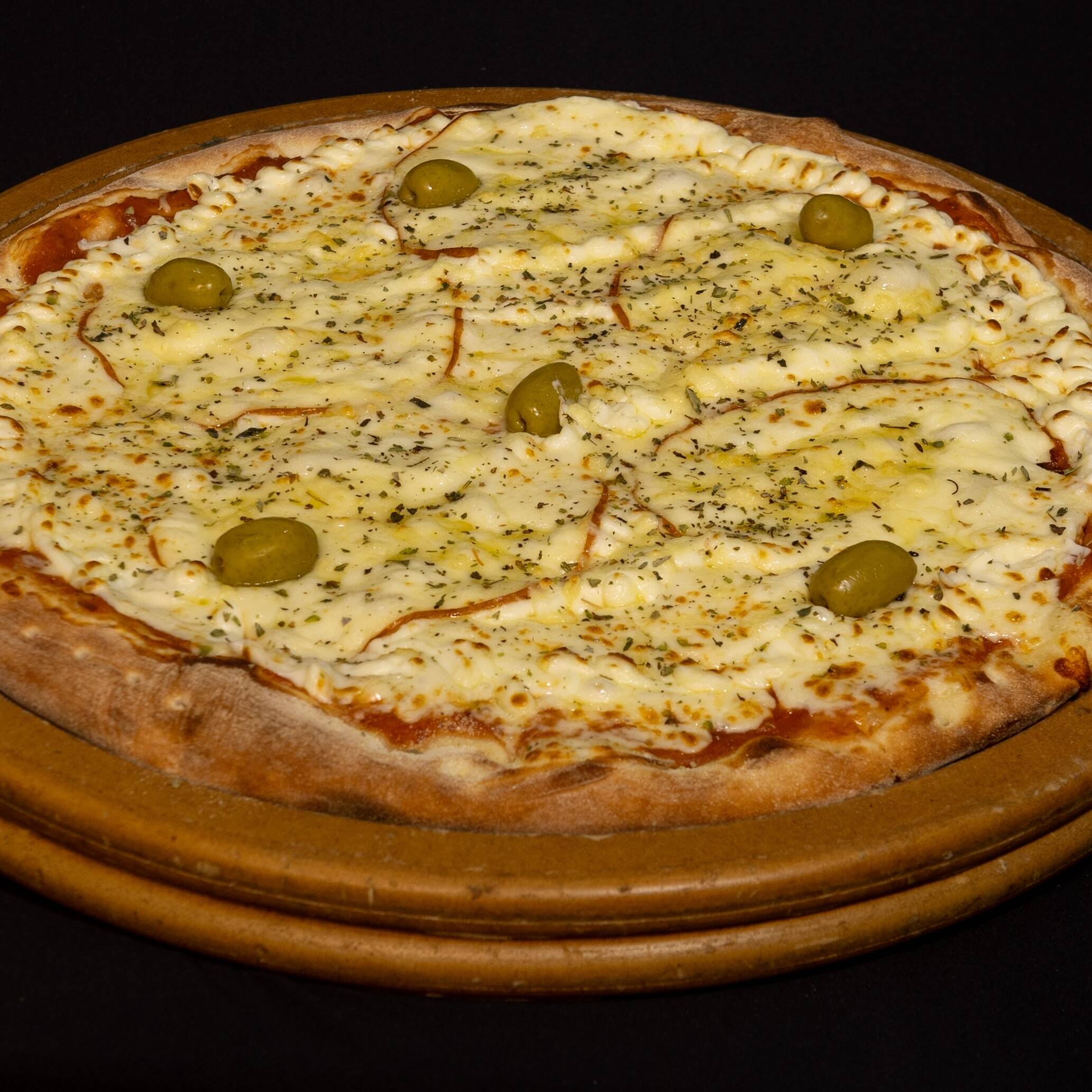 Molho de tomate, mussarela, requeijão cremoso, provolone, parmessão, orégano e azeitonas