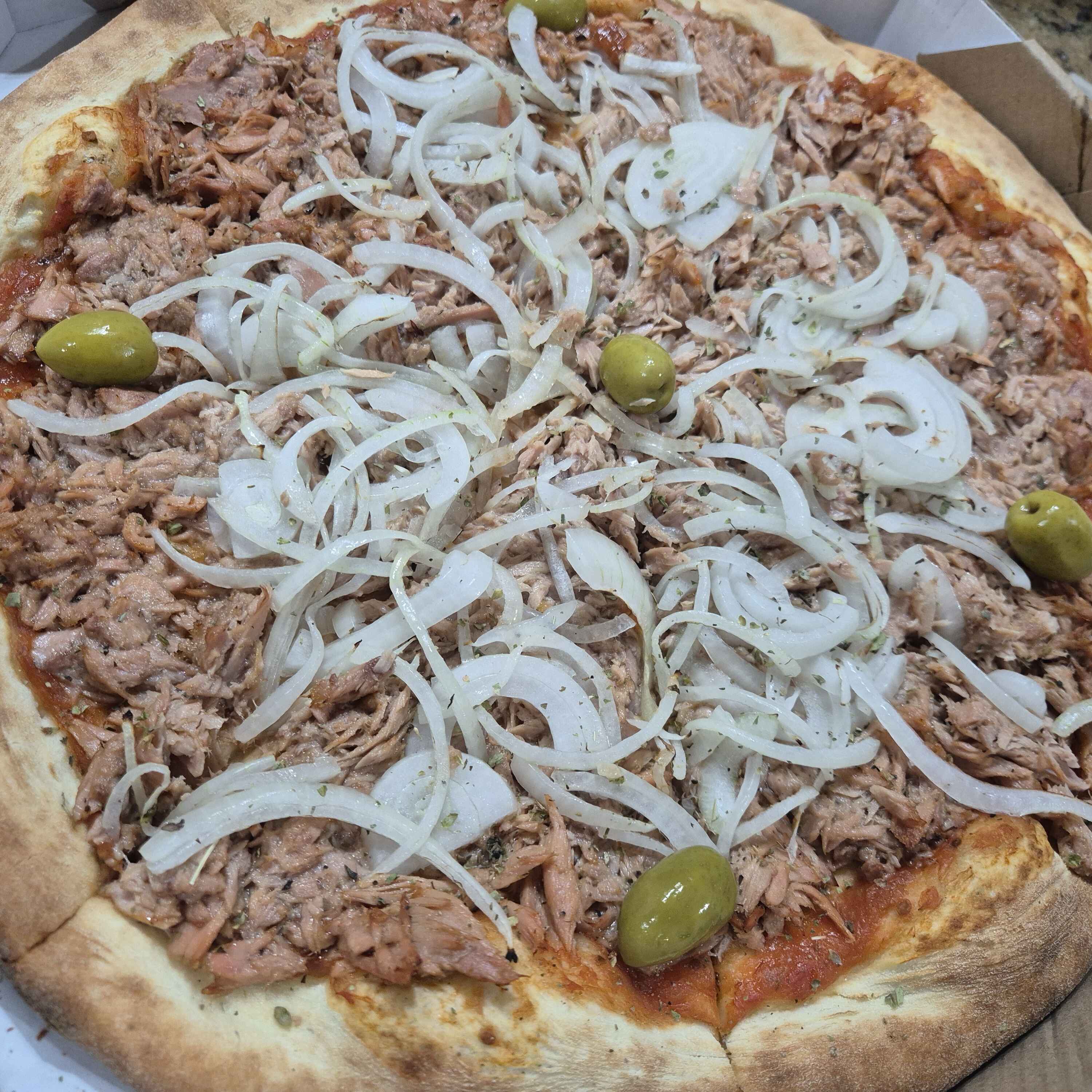 Molho de tomate, atum, cebola, orégano e azeitonas