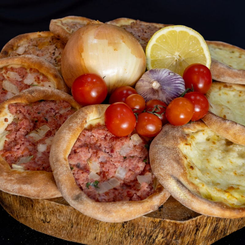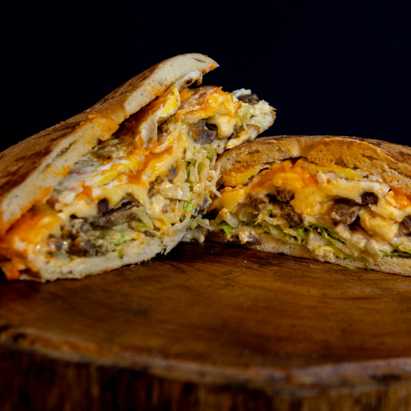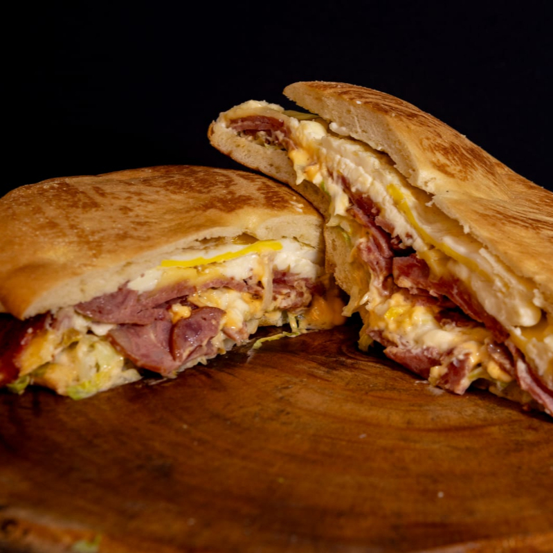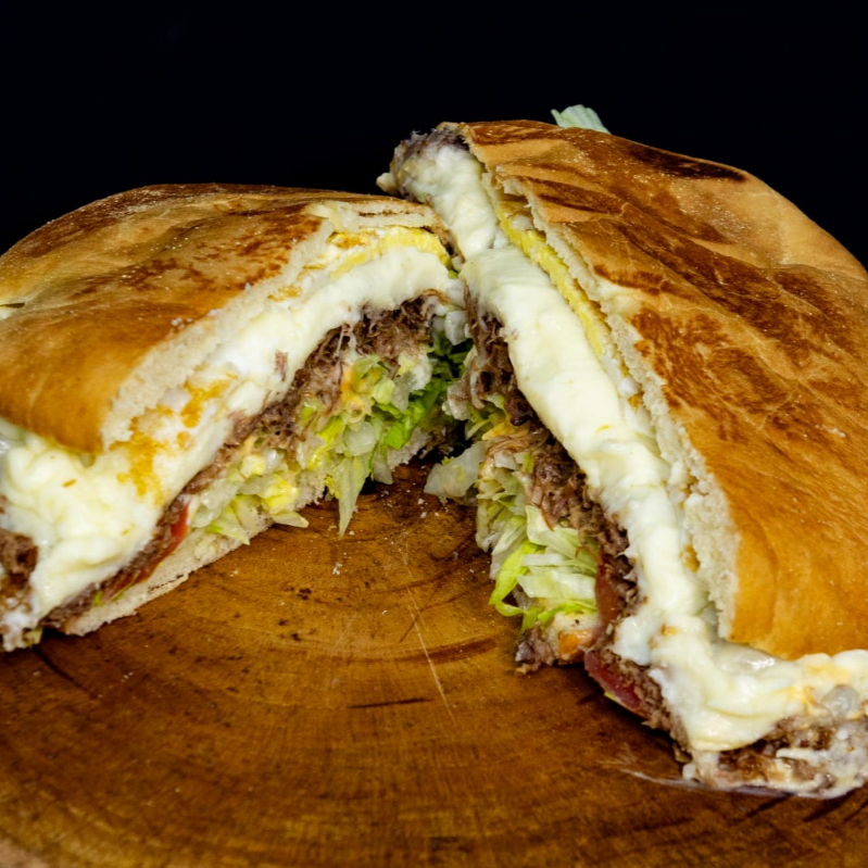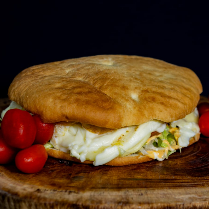 Pão Sirio caseiro, alface, tomate, maionese, molho billy jack, hamburguer, bacon, presunto, catupiry, cheddar, ovo e mussarela