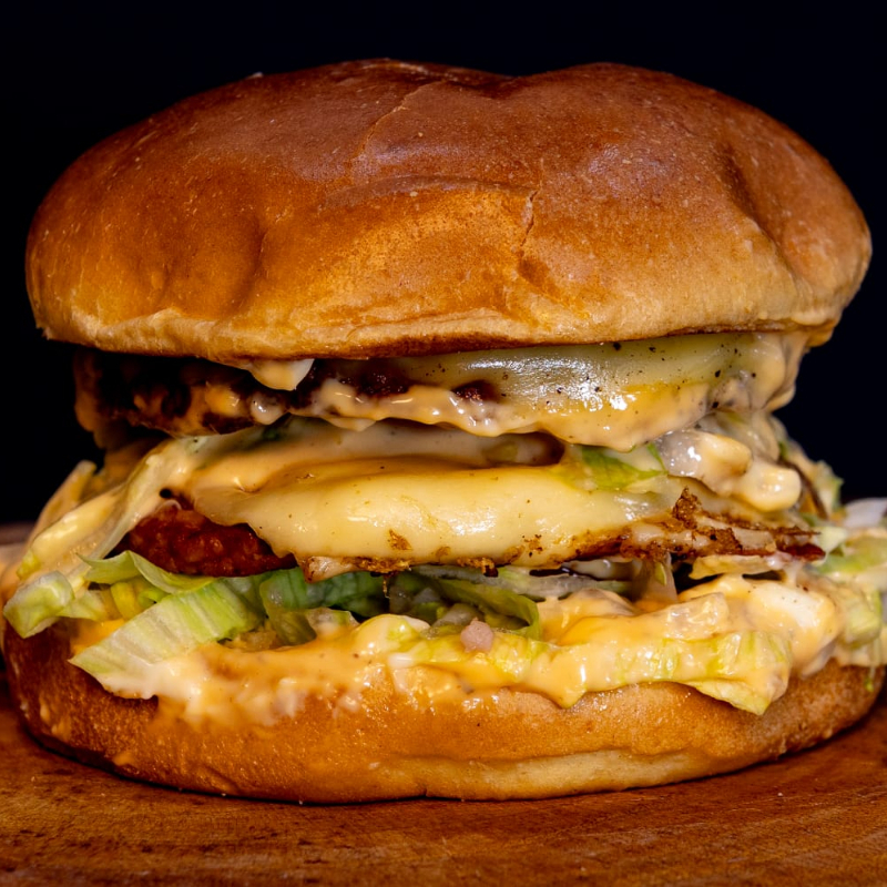 Pão de hamburguer, alface, tomate, maionese, molho billy jack, 2 hamburgues e mussarela