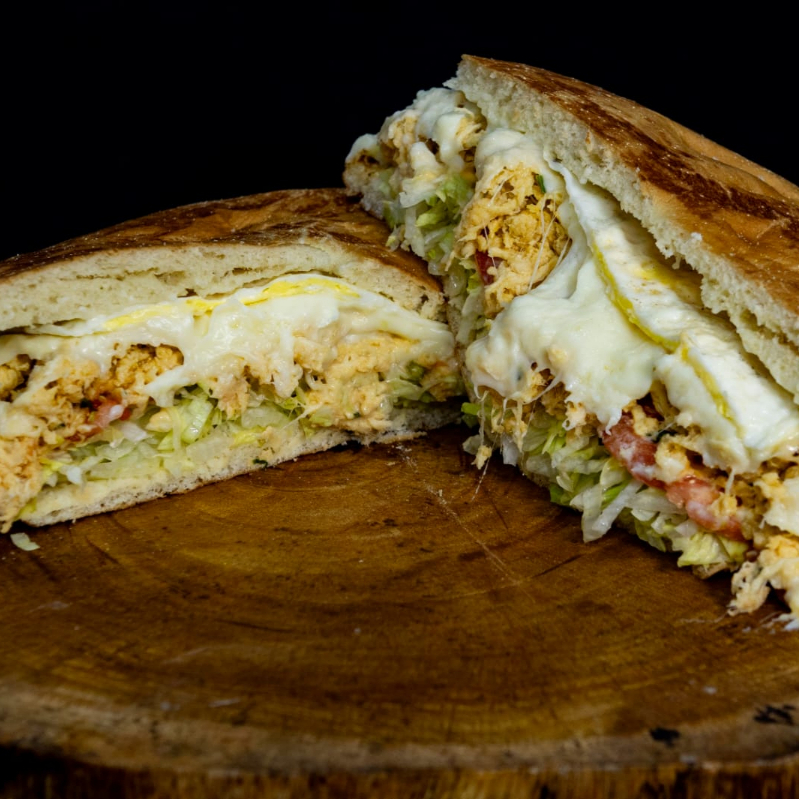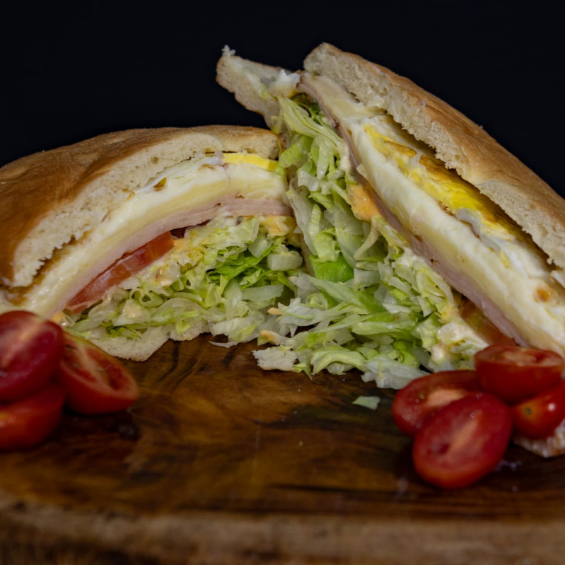 Alface, tomate, maionese, molho billy jack, peito de peru, ovo, catupiry e mussarela