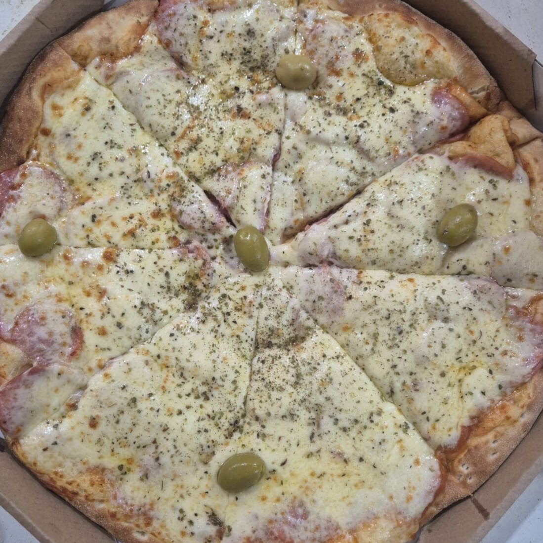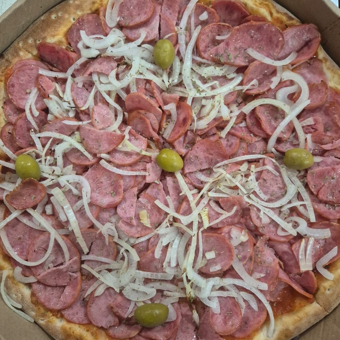 Molho de tomate, Calabresa fatiada, mussarela derretida, oregano e azeitonas
