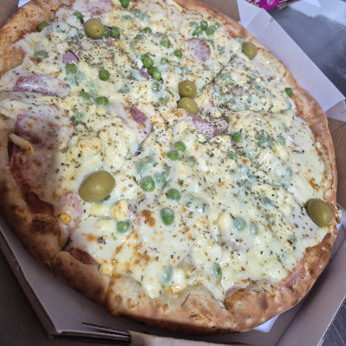 Molho de tomate, presunto, calabresa, ovos, cebola, ervilha, mussarela, orégano e azeitonas