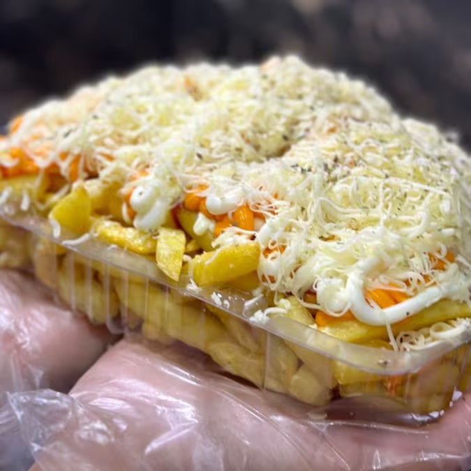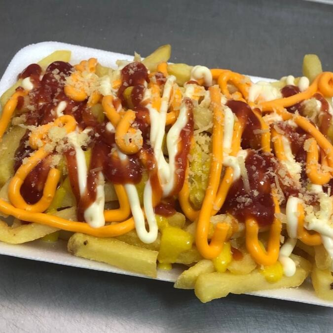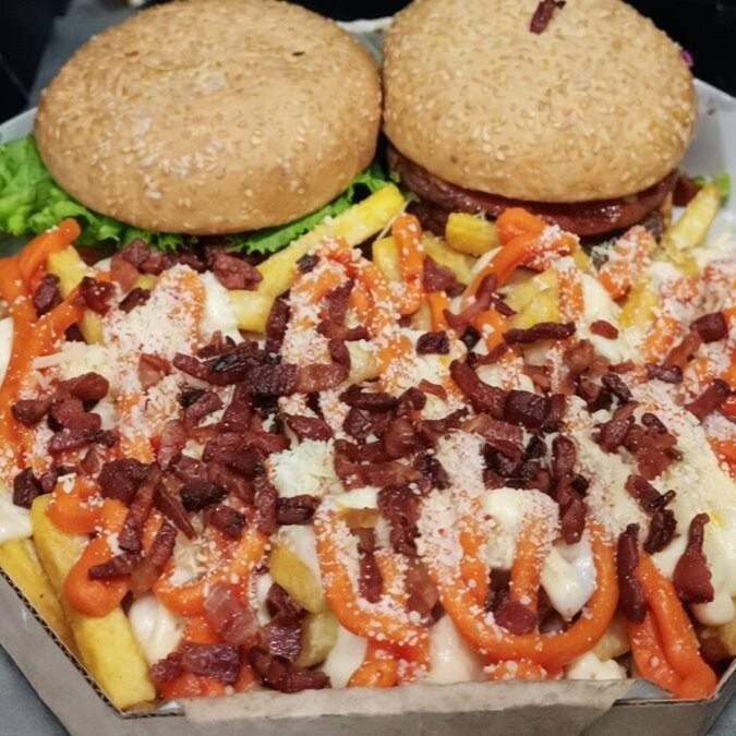 Acompanha: ketchup, maionese, mostarda, Catupiry, cheddar, mussarela, bacon, calabresa, alho frito e orégano.