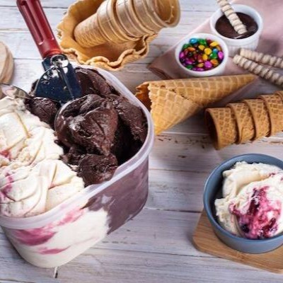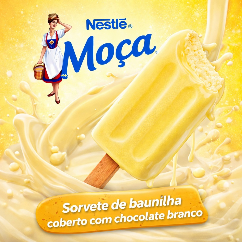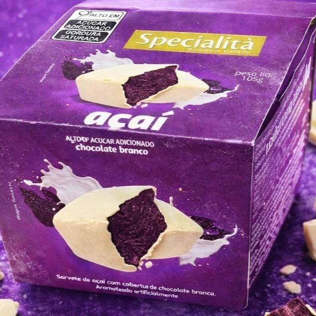 Sorvete de açaí com cobertura de chocolate branco aromatizado artificialmente.