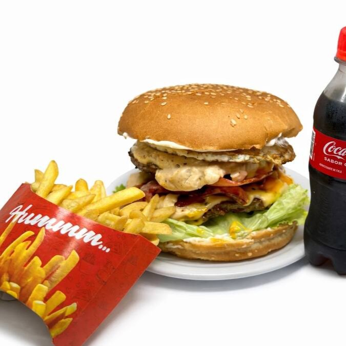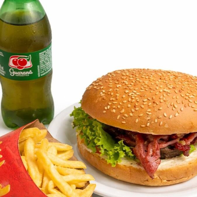 Maionese,hambúrguer,bacon,chadder,mussarela,molho tasty,batata e refrigerante 200ml