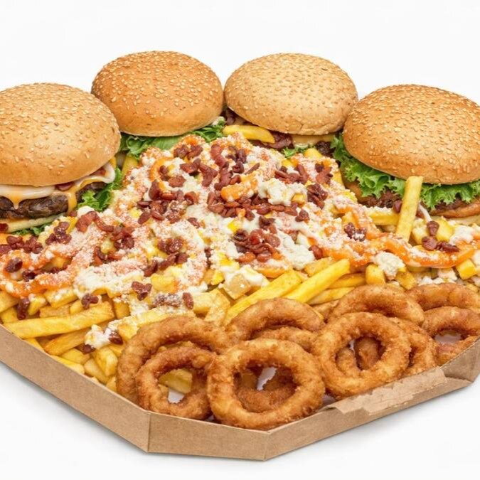 Escolha quatro lanches grandes: x-burguer, x-salada ou x-bacon + porção de batata (Na batata vem: ketchup, maionese, mostarda, cheddar e queijo ralado) e acompanhado na caixa de pizza comum
