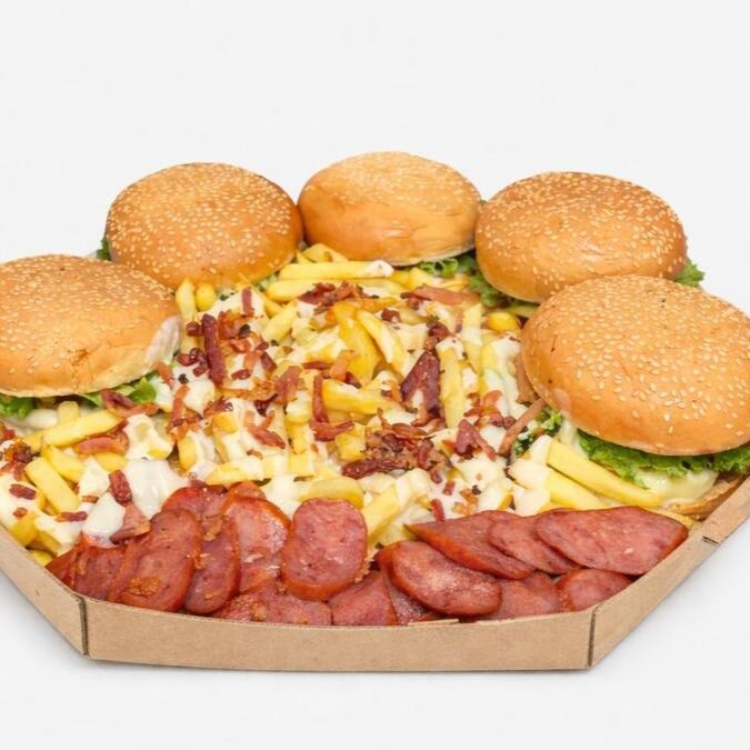 Escolha 05 lanches: x-burguer, x-salada ou x-bacon + porção de batata (Na batata vem: ketchup, maionese, mostarda, cheddar e queijo ralado) e acompanhado na caixa de pizza comum