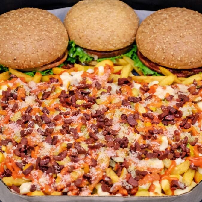 Escolha três lanches: x-burguer, x-salada ou x-bacon + porção de batata (Na batata vem: ketchup, maionese, mostarda, cheddar e queijo ralado) e acompanhado na caixa de pizza comum