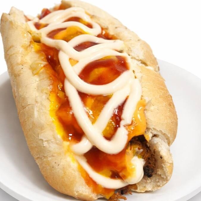 Maionese,mussarela,pernil,vinagrete,catchup,mostarda e chadder.