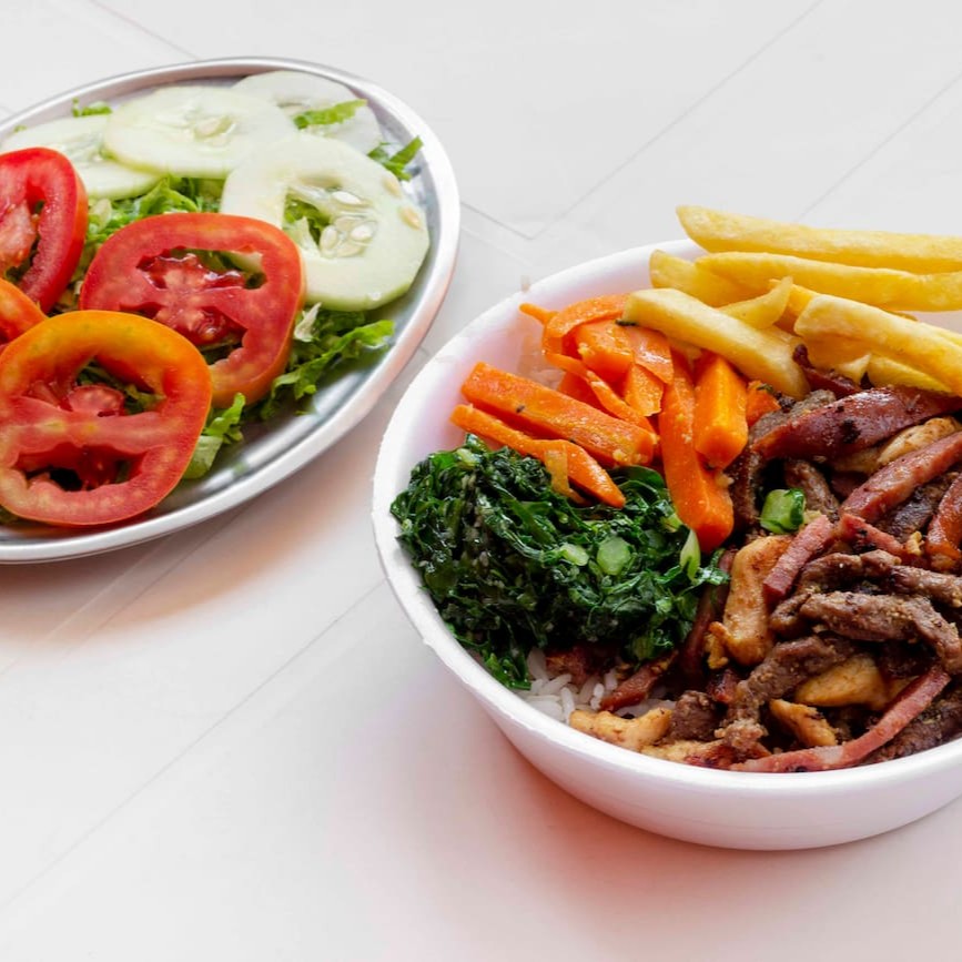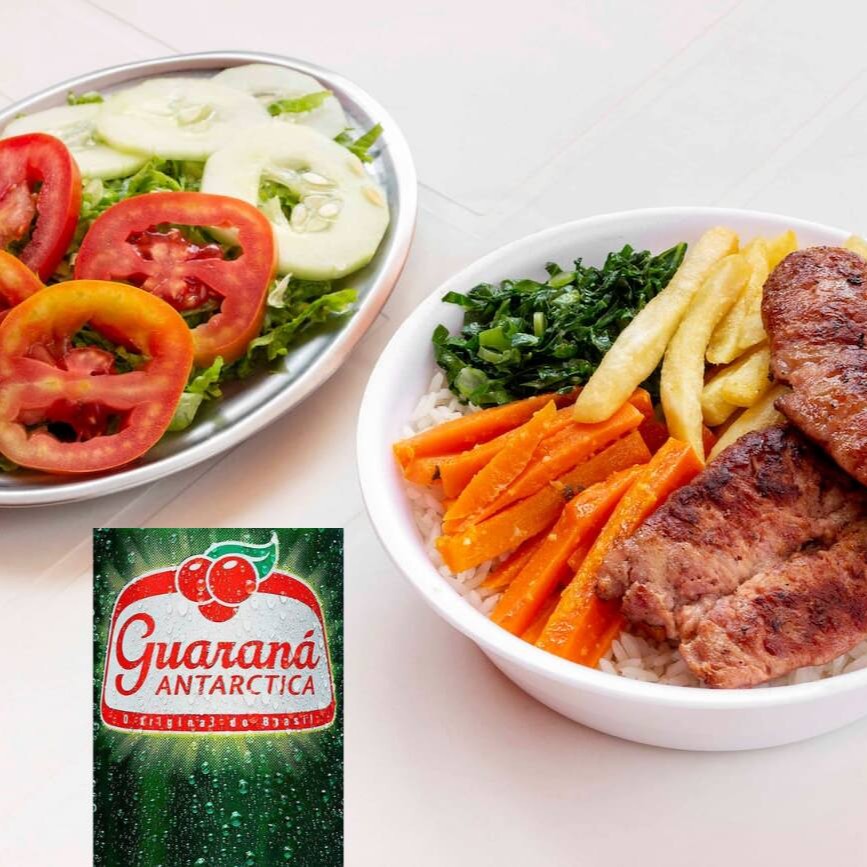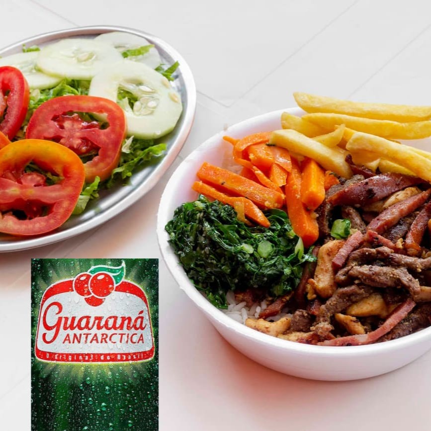 Uma mistura deliciosa de carnes grelhadas. São iscas de frango, carne e linguiça calabresa acompanhadas de arroz branco, feijão carioca e mais 2 adicionais a sua escolha com um Guaraná Antarctica gelado.