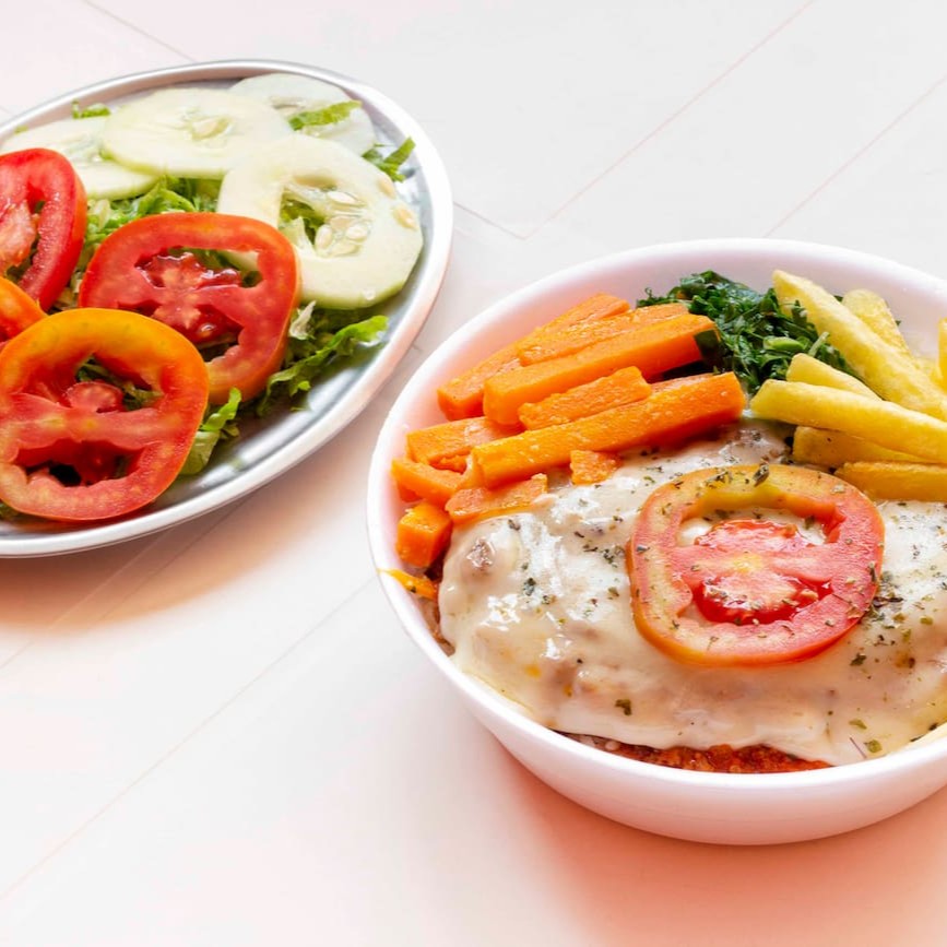 Aquele frango que você gosta coberto por queijo mussarela e molho de tomate deliciosos, acompanhada de arroz branco, feijão carioca e mais 2 adicionais a sua escolha. #almoço #refeição #marmita #marmitex #parmegiana