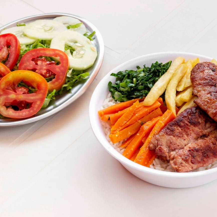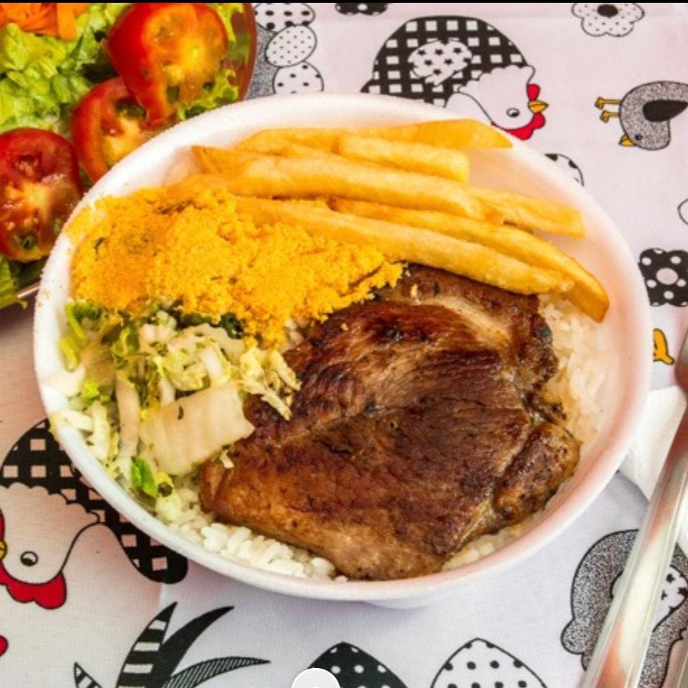 Uma bisteca suculenta, bem grelhada na chapa e temperada com sal, alho, limão e pimenta do reino, acompanhada de arroz branco, feijão carioca e mais 2 adicionais a sua escolha. #almoço #refeição #marmita #marmitex