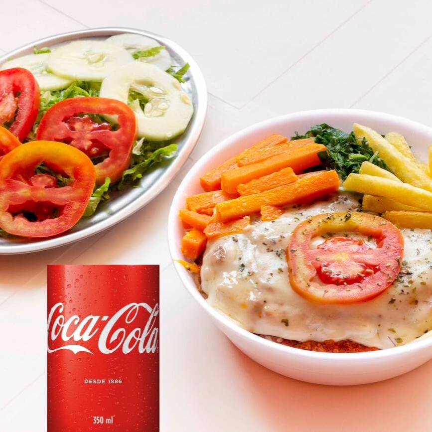 Escolha a parmegiana que você mais gosta coberta por queijo mussarela e molho de tomate deliciosos, acompanhada de arroz branco, feijão carioca e mais 2 adicionais a sua escolha com uma Coca-Cola gelada. #almoço #refeição #marmita #marmitex