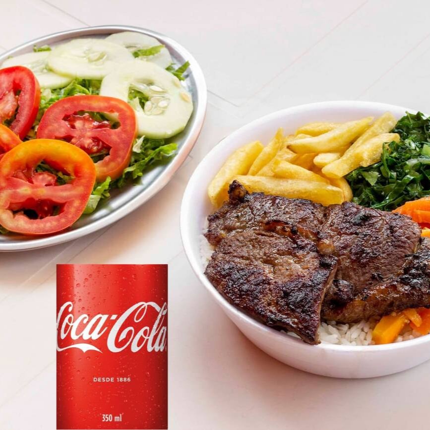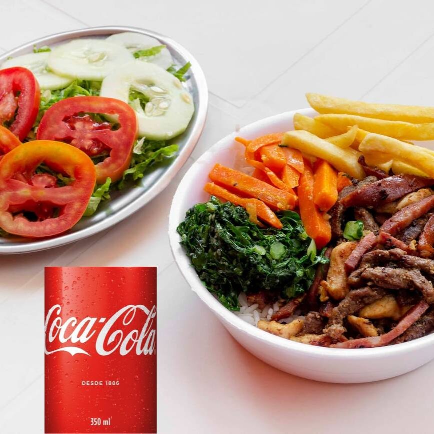 Uma mistura deliciosa de carnes grelhadas. São iscas de frango, carne e linguiça calabresa acompanhadas de arroz branco, feijão carioca e mais 2 adicionais a sua escolha com uma Coca-Cola gelada. #almoço #refeição #marmita #marmitex