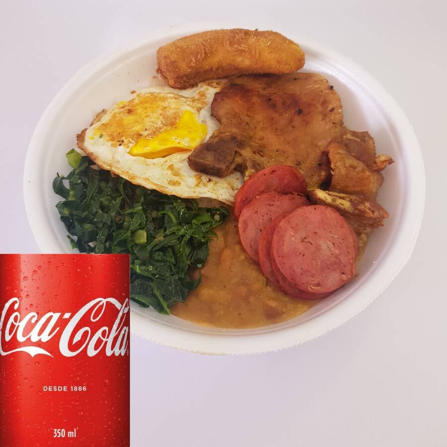 O tradicional prato paulistano cheio de sabor composto por bisteca suína, ovo frito, torresmo, linguiça calabresa, banana empanada, refogado de couve, tutu de feijão e arroz branco + Uma Coca-Cola lata 350ml geladinha.