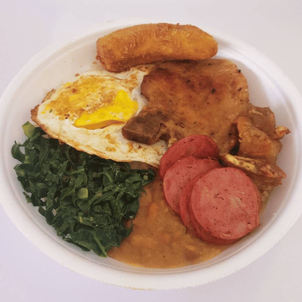 O tradicional prato paulistano cheio de sabor composto por bisteca suína, ovo frito, torresmo, linguiça calabresa, banana empanada, refogado de couve, tutu de feijão e arroz branco.