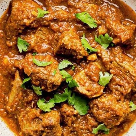1.Cubos de carneiro assado e cozido em molho picante. 2. Arroz Basmati (uma porçao) 3. Butter Naan (Pao de farinha de trigo com manteiga )