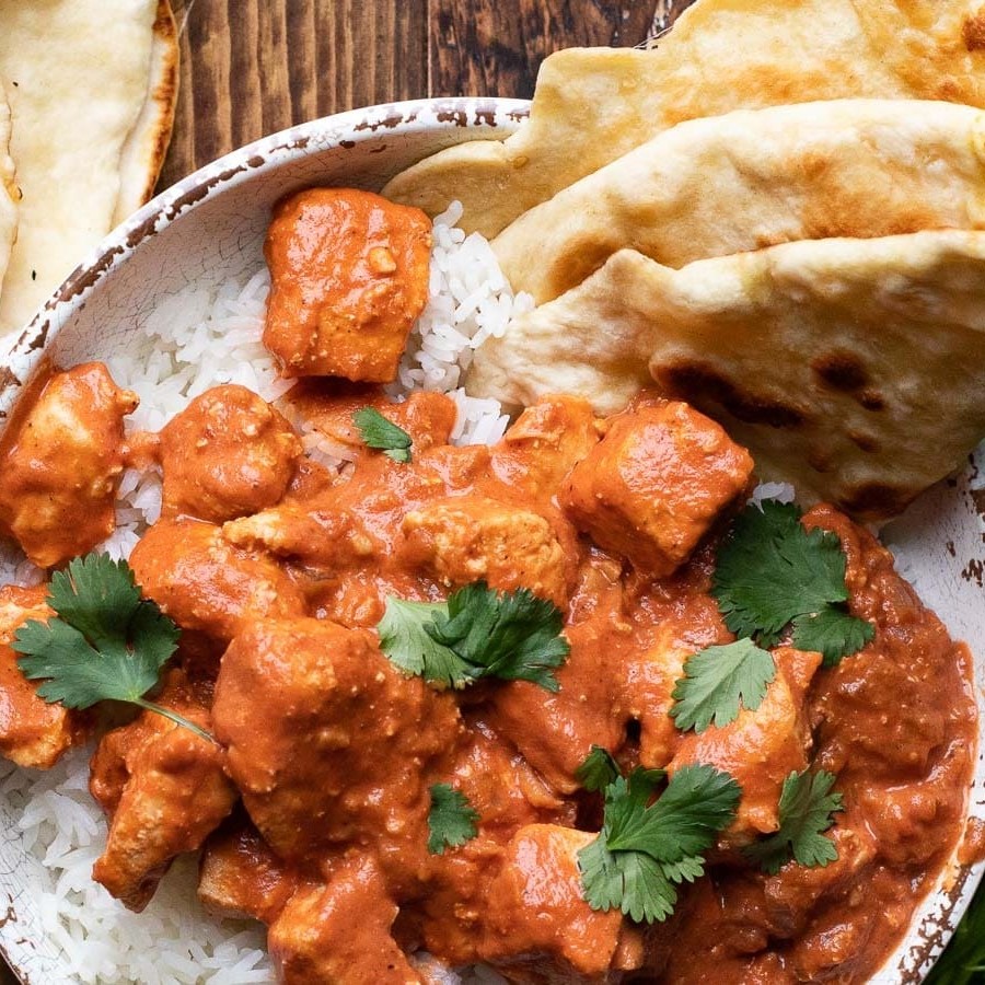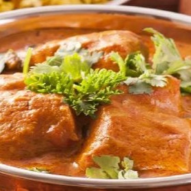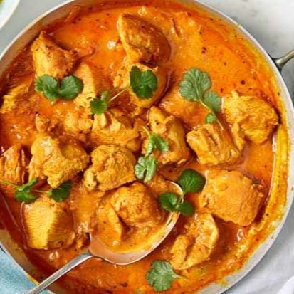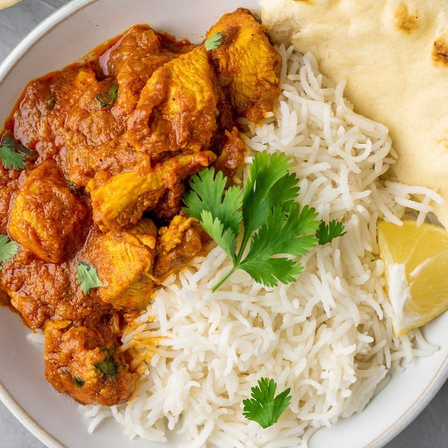 1. Cubos de frango preparados em um molho leve de cebola e tomate, temperados com molho curry e especiarias. 2. Arroz Basmati (uma pote) 250ml 3. Butter Naan (Pao de farinha de trigo servido com manteiga)