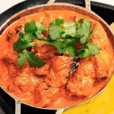 1. Curry de frango suave, servido em um cremoso molho de castanha de caju 2. Arroz Basmati (uma pote) 3. Garlic Naan
