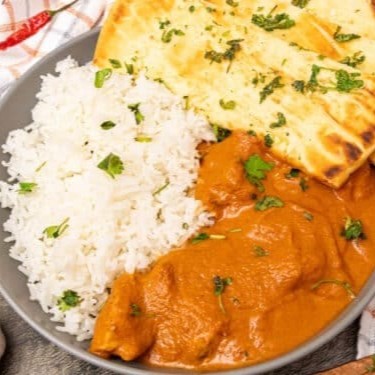 1.Buter Chicken - Cubos de frango temperados e assados no tambor e depois cozidos em um rico molho amanteigado de tomate com condimentos. 2. Arroz Basmati (uma porçao) 3. Butter Naan (Pao de farinha de trigo com manteiga)