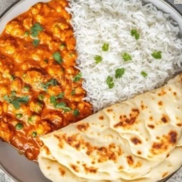 1. Chana Masala ( Grão de bico lentamente cozido em um molho de tomate, cebola e especiarias) 250ml 2. Arroz basmati ( uma pote ) 250ml 3. Butter Naan (Pao de farinha de trigo servido com manteiga)