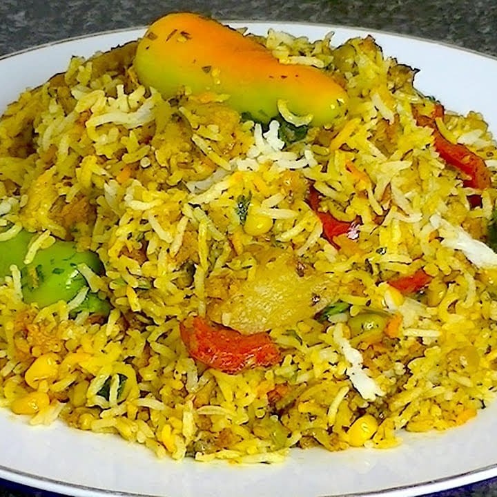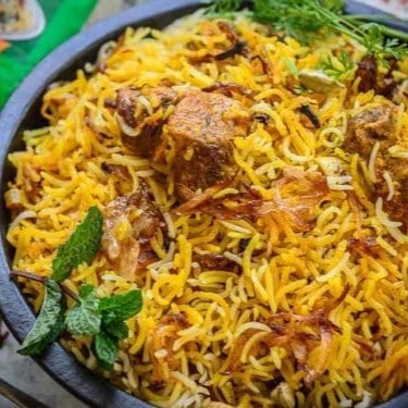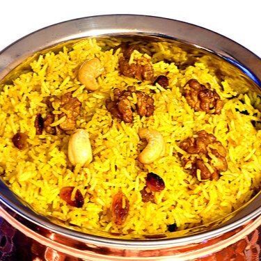 Prato de frango e arroz basmati cozido aromatizado com especiarias indianas