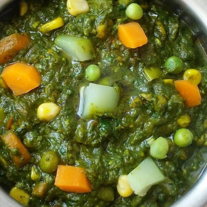 1. Cubos de carneiro cozido e temperado em um cremoso molho de espinafre e especiarias. 2. Arroz Basmati (uma porçao) 3. Butter Naan (Pao de farinha de trigo com manteiga )