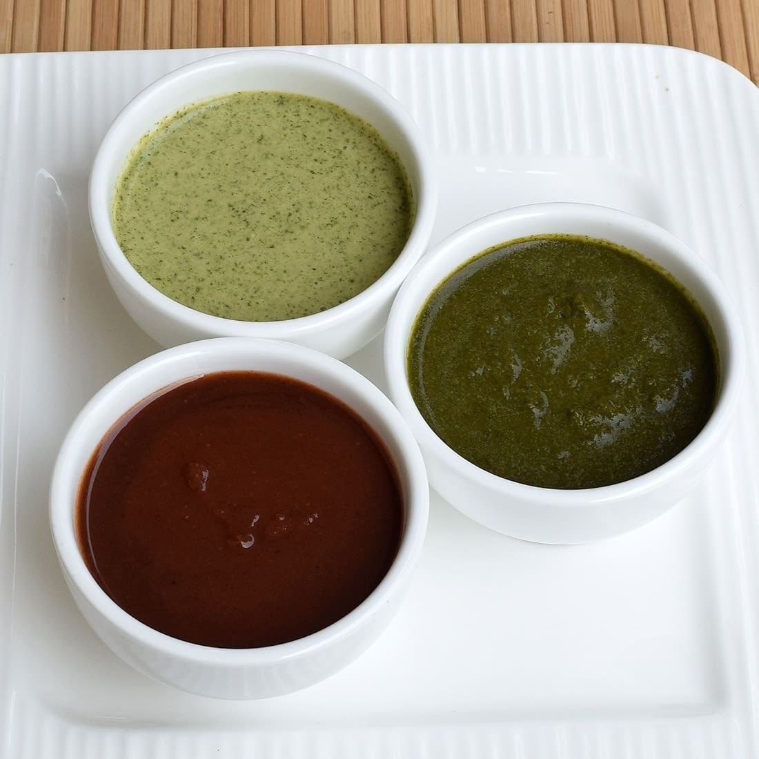 Seleção de molhos da casa de hortelã, tamarindo e papaia