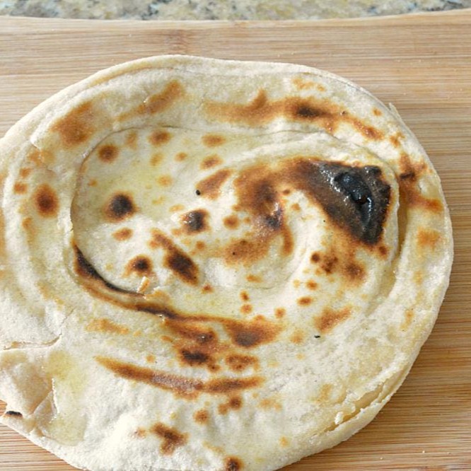 Pão fino e macio com um lenço preparado em uma chapa especial