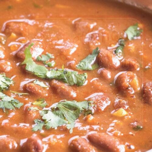 Feijão preparado ao molho de tomate e temperado com especiarias indianas