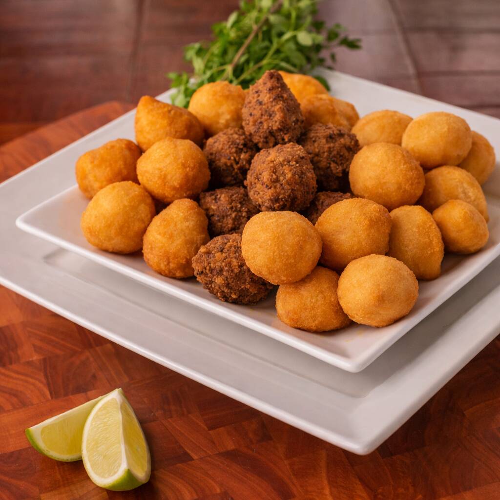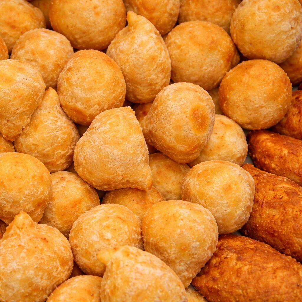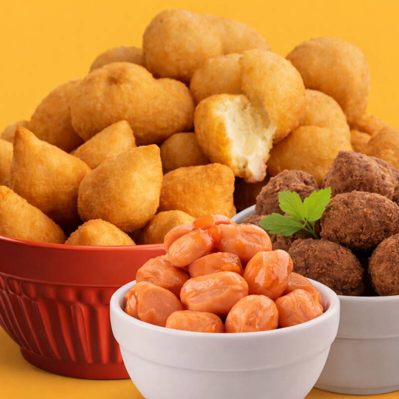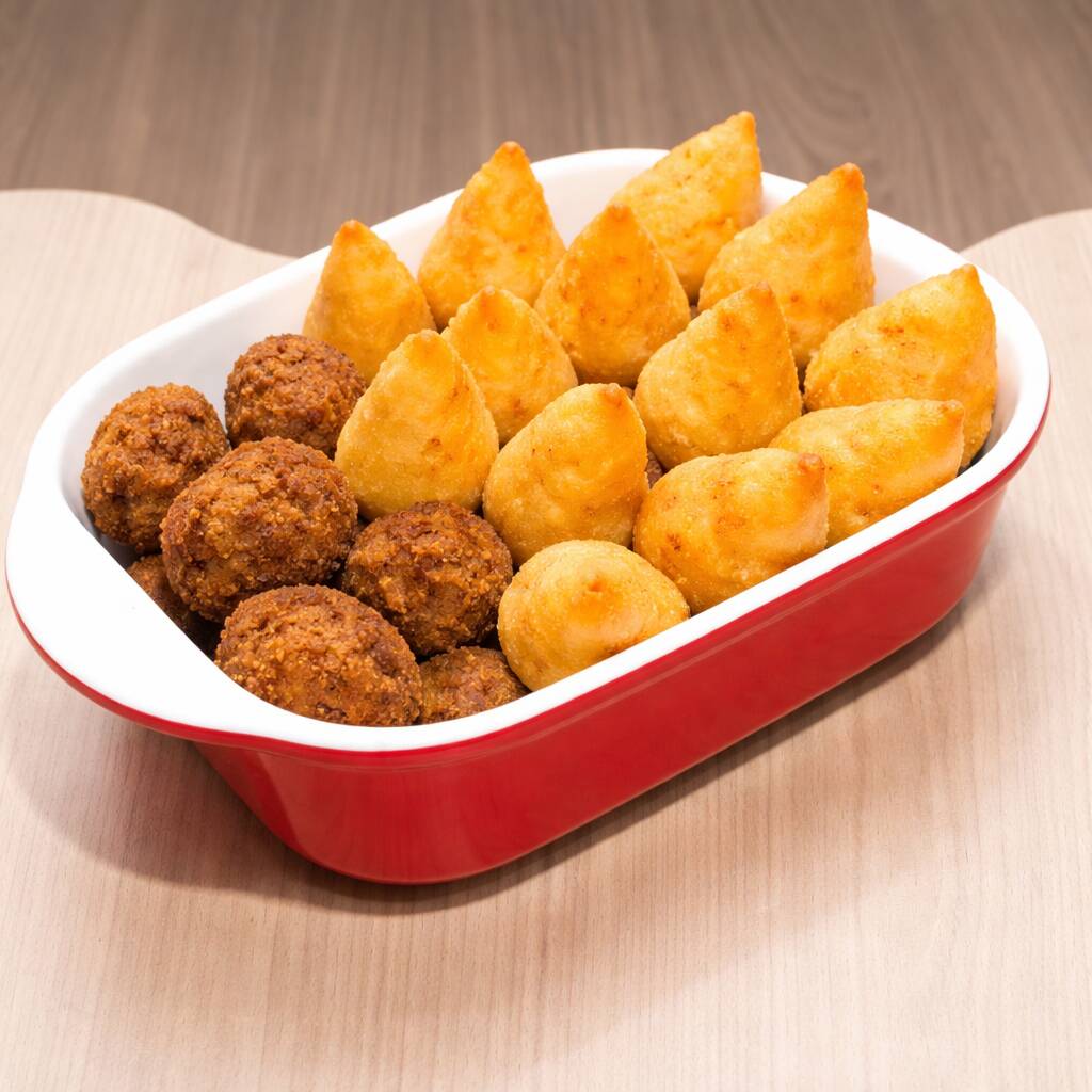 Porção com 50 mini salgados irresistíveis: coxinha, bolinho de carne, bolinho de queijo, bolinho de calabresa e bolinho de presunto com queijo.