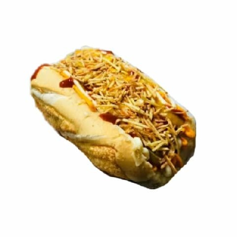 Pão+1 Salsicha suculenta + maionese + Purê + milho + vinagrete +Batata palha +cheddar +queijo ralado