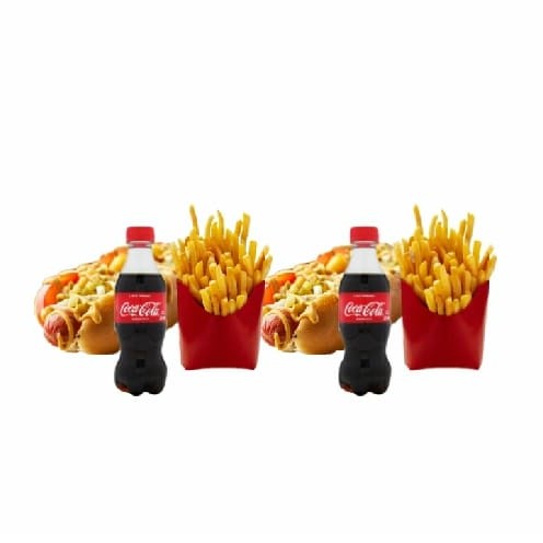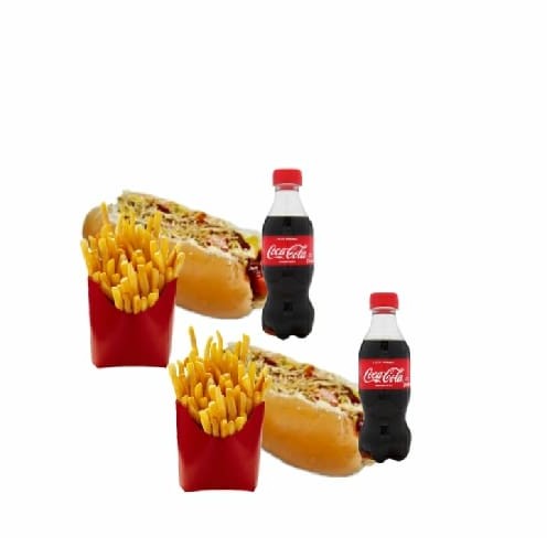 2 Hot Dog completo + 2 Batata frita + 2 coquinha
