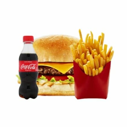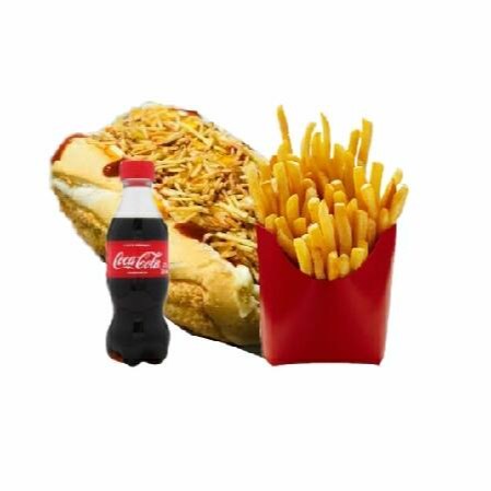 1 dogão + batata frita + Coquinha. Dogão = Pão +2 salsicha +maionese + purê + milho + vinagrete + Batata palha + Cheddar + queijo ralado