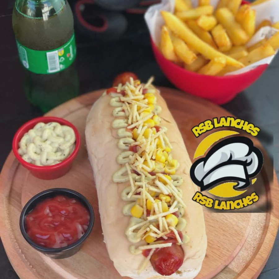 Hot Dog completo: Pão, salsicha suculenta, milho, vinagrete, purê, batata palha, molho especial da casa