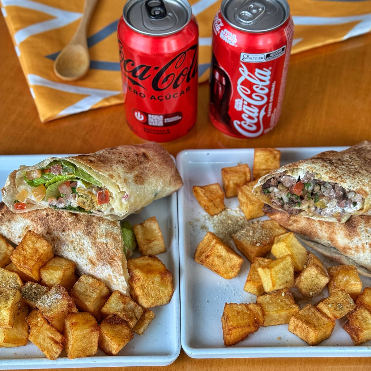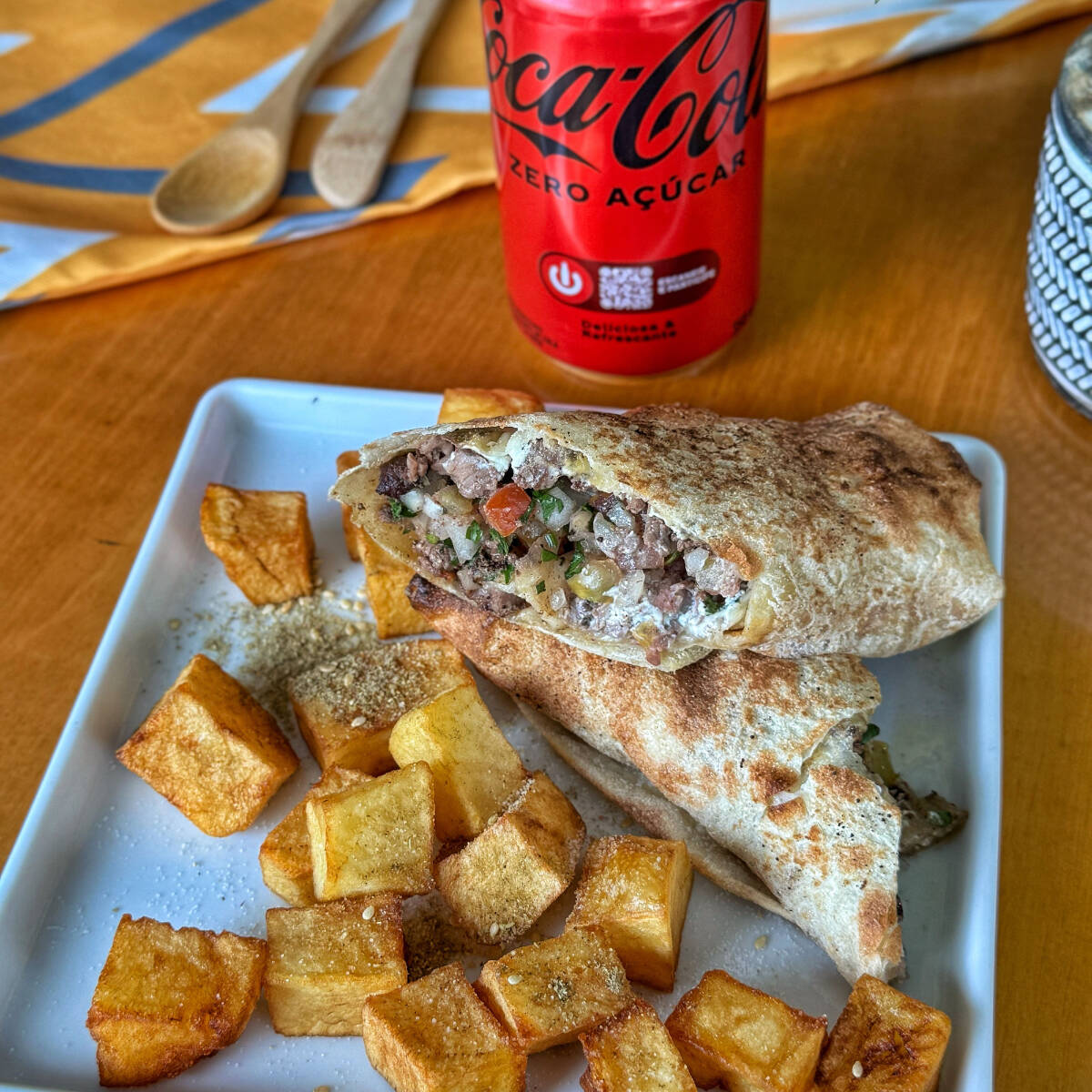 Pão saj enrolado com frango, coalhada seca e vinagrete, acompanha batata frita e uma coca cola