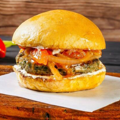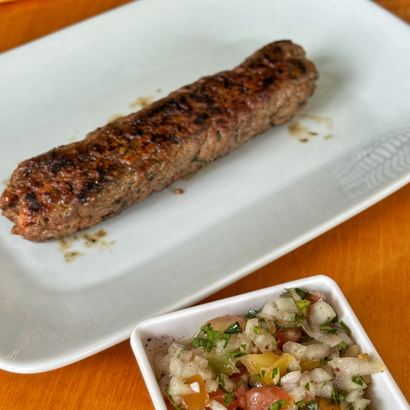 Hamburguer de 120g de kafta assado na chapa, com molho acebolado, coalhada seca no pão de mandioquinha. Acompanha batatas fritas ao estilo árabe.