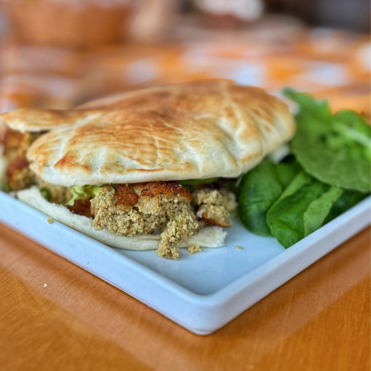 Delicioso aarouz feito no pão sírio. Recheio de falafel, coalhada seca e vinagrete. Acompanha batata frita ou folhas de rúcula.