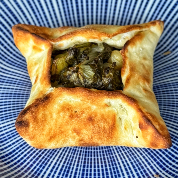 Deliciosa esfiha aberta de Escarola com Mussarela. Massa leve e recheio na medida certa.