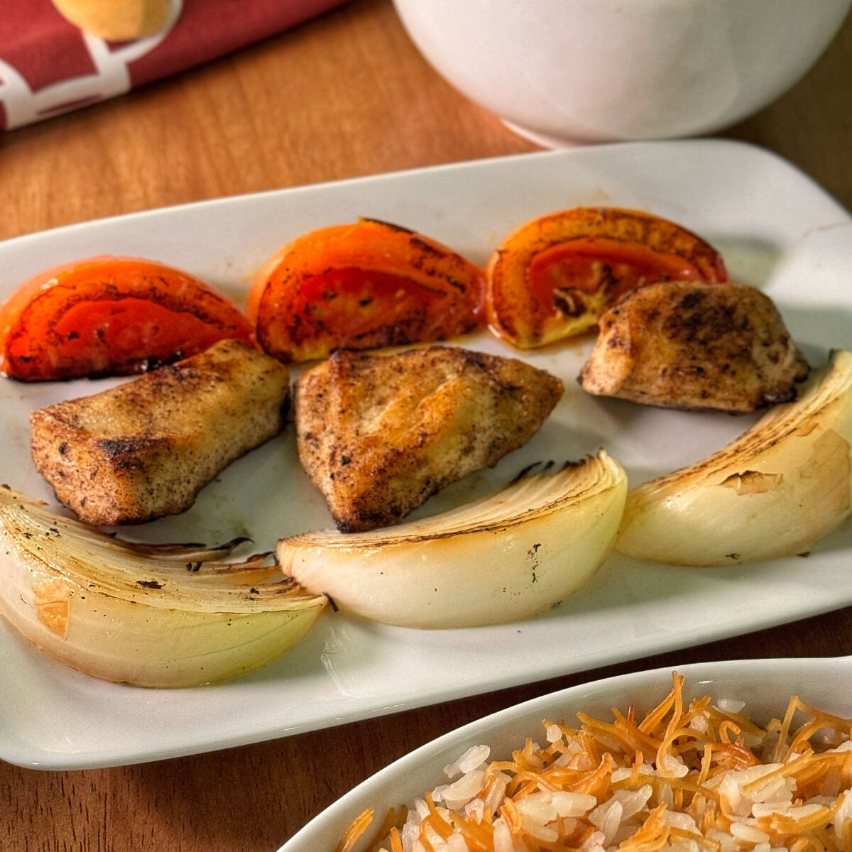 Delicioso aarouz enrolado no pão saj com frango, coalhada seca e vinagrete. Acompanha batata frita