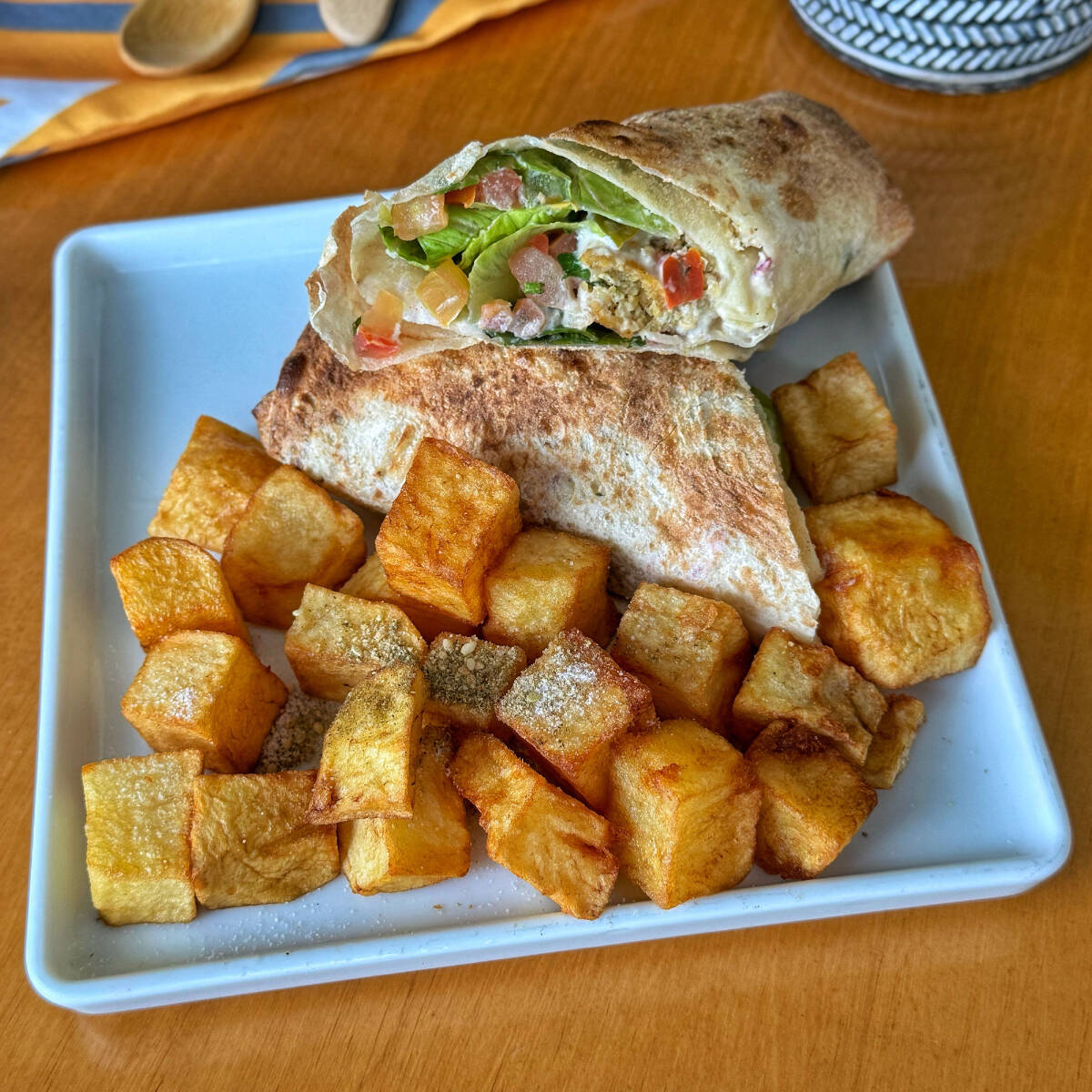 Delicioso aarouz enrolado no pão saj com faláfel, coalhada seca e vinagrete. Acompanha batata frita