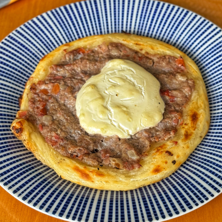 Deliciosa esfiha aberta de carne com coalhada. Massa leve e recheio deliciosamente temperado.