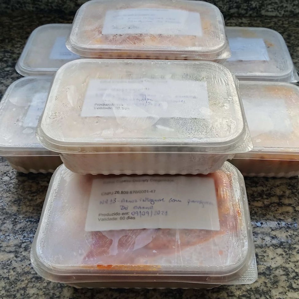 Kit com 7 marmitas com as seguintes variações : Frango desfiado com purê de batata doce e brócolis / Arroz integral com cenoura frango desfiado e brócolis / Arroz integral com frango Xadrez / Frango desfiado com purê de mandioquinha e vagem / Arroz integral com Strogonoff de frango/ Arroz integral com panqueca de palmito / Nhoque de batata doce ao sugo - Marmitas nª 12/17/25/33/36/42/44 Peso Total: 2800g - Produto congelado - Entrega em até 48 horas
