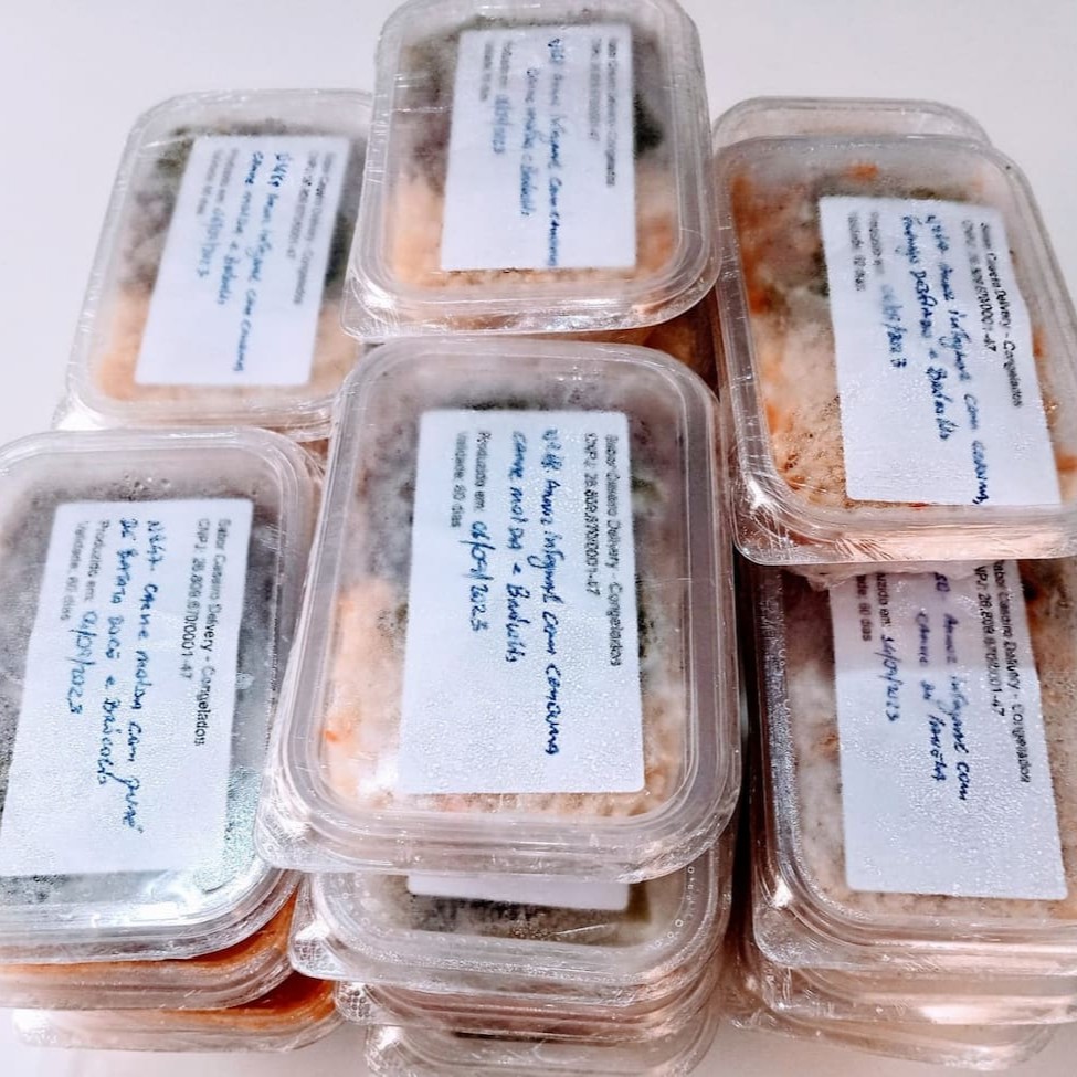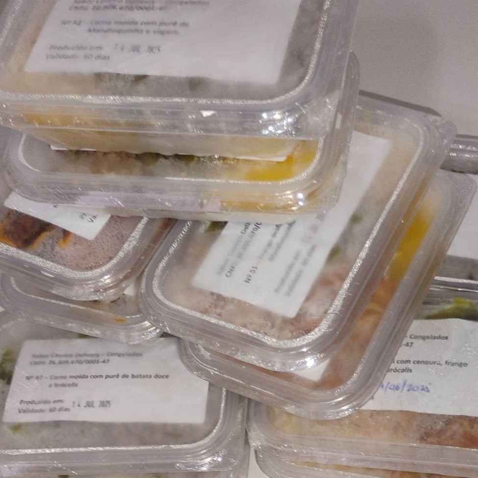 Kit Fit com 14 marmitas, sendo 2 unidades de cada um dos seguintes nos.: 46/47/48/49/50/51/52 - Frango desfiado com purê de batata doce e brócolis / Carne moída com purê de batata doce e brócolis /Arroz integral com cenoura, carne moida e brócolis/ Arroz integral com cenoura,frango desfiado e brócolis / Arroz integral com carne de panela e cenoura/ Frango desfiado com pure de mandioquinha e vagem / Carne moída com pure de mandioquinha e vagem - Peso total: 2800g - Produto congelado