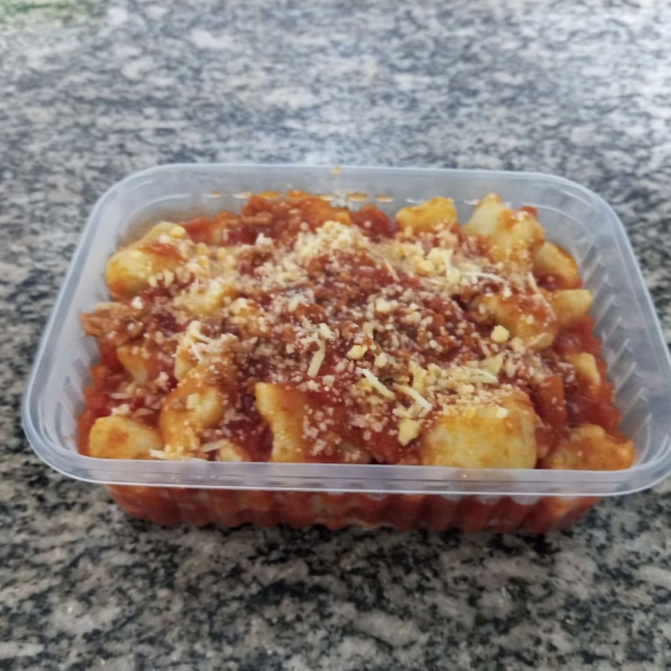 Nhoque de batata doce a bolonhesa, molho de tomate, carne moída, queijo parmesão, embalagem própria para freezer e microondas - peso: 300g - produto congelado - Entrega em até 48 horas